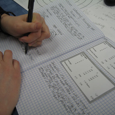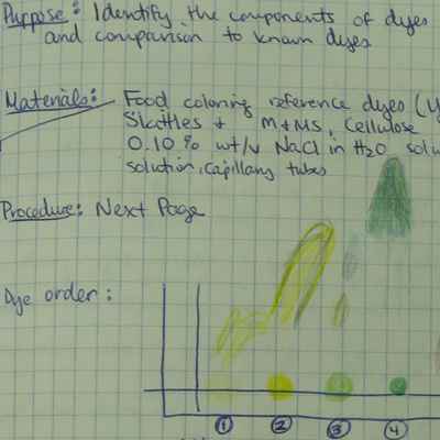 The key to a successful notebook is immediacy, recording observations directly into the notebook while in the lab. After the labortory is over it is important to return to your notebook and continue to add your thoughts, organize and attach any extras (photos, printed sections, etc.), and complete the laboratory write-up. You may find it useful to have a variety of ink colors available. Pencil should NEVER be used in a laboratory notebook as it fades or could be altered or erased. Also you need to resist the temptation to use any kind of white-out. Errors should have only one line through them and should remain impossible possible to read (just in case these entries need to be reconsidered). A laboratory notebook is not an ART notebook even though it can be very attractive. It has to also look like it has been used during laboratory and that means it may have some spills in it. Be careful to keep it away from any substances that are toxic - and that means you need to know about the properties of the chemicals you use.